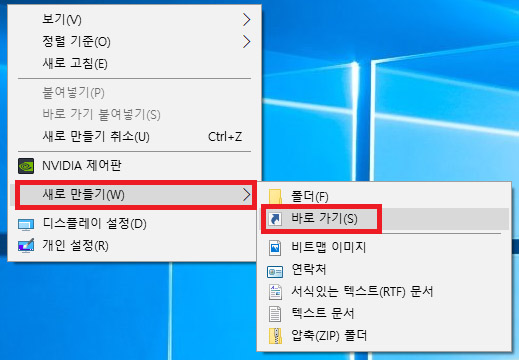 윈도우 10 바탕화면 빈 공간에서 우클릭 > 새로 만들기 > 바로가기 를 선택한다.