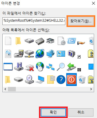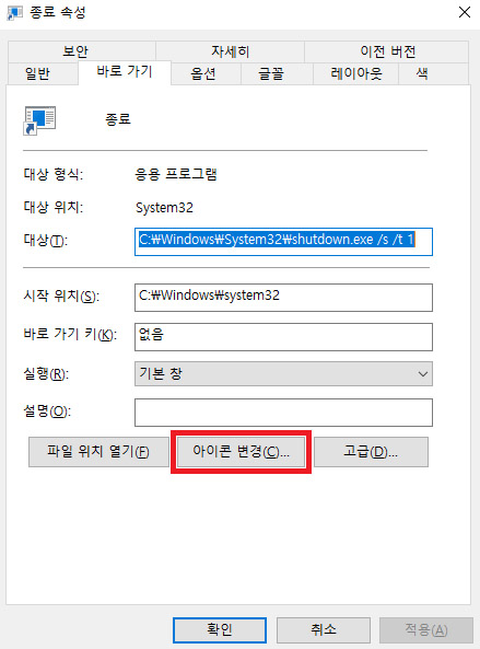 바로가기 아이콘 우클릭 > 속성 > 아이콘 변경 에서 아이콘을 변경하면 종료 바로 가기 아이콘을 만들 수 있다.